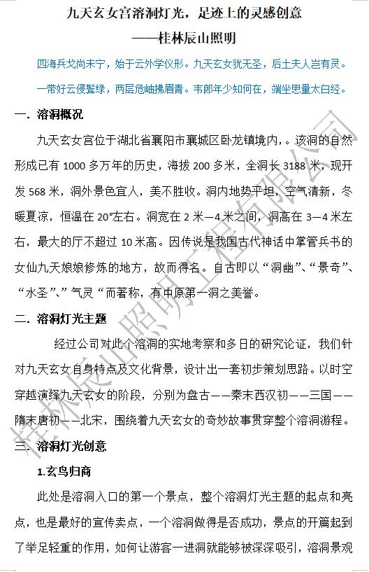將自然景觀與文化巧妙結(jié)合,用溶洞燈光傳播玄文化靈魂,結(jié)合文化藝術(shù)進(jìn)行高度概括,用光點(diǎn)出景色精華,升華景色境界,使游客情思生于景、融于景。