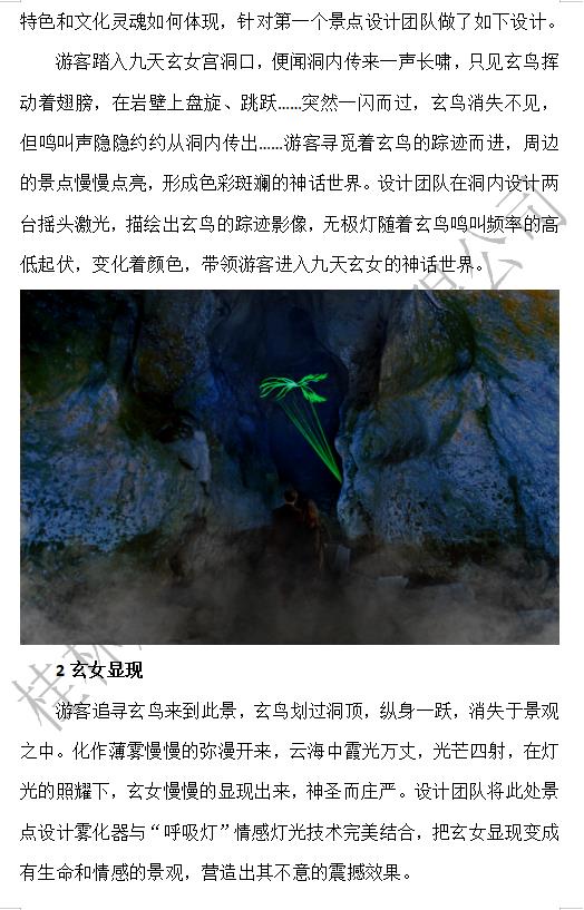 巧用現(xiàn)代溶洞燈照明技術(shù),“有聲”的描述出玄女故事的文化內(nèi)涵,“有色”的勾勒出九天玄女的外貌形象和身份地位,揭開九天玄女的神秘面紗,
